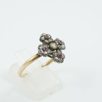 Bague en or 750 mil et argent 800 mil pouvant figurer une fleurette rehaussée de roses, de diamants TA et de pierres rouges (Dim chaton : 1,4 cm; TDD : 61) (Transformation). 3,8 g brut.
