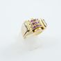 Bague pont en or 750 mil et platine 850 mil centrée de 3 lignes de pierres rouges (certaines égrisées) épaulées de roses (TDD : 55). 9,6 g brut.