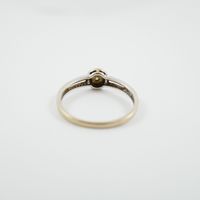 Bague en or gris 750 mil. centrée d’un diamant brillanté de 0,04 carat environ entouré et épaulé de diamants brillantés (TDD : 54) (diamètre : 0,6 cm environ) (légère déformation). 1,9 g. brut