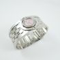 GUCCI « Twirl ». Bracelet-montre de dame en acier, petit boîtier rond réversible, lunette sertie de diamants brillantés, cadran en nacre rose muet, mouvement à quartz, bracelet rigide articulé ajouré et monogrammé et boucle à cliquet en acier, signé et numéroté, réf. 112 (diamètre : 17 mm environ) (largeur : 23 mm environ) (longueur : 18 cm environ).