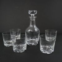 DAUM France Carafe (H. 25 cm) et cinq verres à whisky (H. 9 cm), modèle BLANZEY, en cristal blanc transparent de forme cylindrique et base moulée de flammes obliques. Signés DAUM à la pointe sous la base. Travail moderne. (Un léger éclat sur un verre)