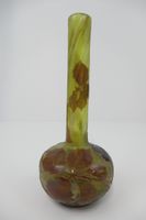 DAUM Nancy Vase soliflore à long col et base renflée. Epreuve en verre multicouche dégagé à l'acide à décor de branches de mûrier dans les tons bruns et orangés sur fond vert. Signé Daum Nancy à la Croix de Lorraine sur la panse. Vers 1900. Hauteur : 19 cm.