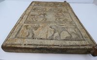 NEPAL Petite porte rectangulaire en bois patiné ornée en reliefs d’animaux et de personnages stylisés. Dimensions : 56 x 35,5 cm. (Ancienne patine et marques d’usages)