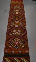Tapis-galerie KILIM en laine polychrome à décor de six médaillons losangiques encadrés de motifs géométriques. Dimensions : 360 x 88 cm.