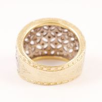 Bague bandeau deux ors 750 mil. guilloché, ciselé et maté, à décors floral ponctué de diamants brillantés. Travail italien. (Largeur 1,5 cm environ) (légère entaille à la monture) (TDD : 53). 11,9 g. brut.