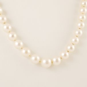 Collier de perles de culture légèrement en chute (Diamètre : de 5,3 mm à 8,6 mm environ). Fermoir et chaîne de sécurité en or 750 mil. (Longueur : 60 cm) (usures). 34,9 g. brut.