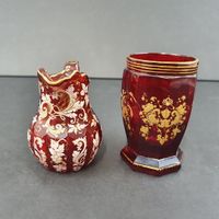 2 pièces de service en verre rouge, vers 1880 : - Crémier balustre, le corps à pans et godrons, le col festonné, le décor émaillé blanc et or de feuillages et pampres de vignes de style rocaille. Non signée. H. 8 cm. Micro rayures, Infimes usures à la dorure. TBE.- Petite chope à pans et base octogonale à décor doré de filets, volutes de feuillages et fleurettes de style rocaille. Non signée. H. 9 cm. ; Diam. au col. 5.3 cm. Micro rayures, usures à la dorure. TBE.S’il est difficile d’identifier la Manufacture verrière exacte de ces 2 pièces, il est certain qu’elles ont la même provenance. Nous retrouvons, en effet, le motif doré ovale sur la partie aplatie supérieure des 2 anses.