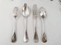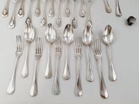 A. CALLE, XIXe siècle, vers 1870 : suite de 12 grands couverts en argent 950 mil. modèle baguette à médaillon ovale perlé et petites agrafes feuillagée. Minerve 1er titre de 1838 et poinçon de Maître. Poids : 1778.7 g. Rayures et usures. Non chiffré.