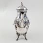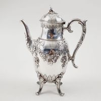 GALLIA de la maison CHRISTOFLE, circa 1905 : cafetière ovoïde en métal argenté de forme quadripode à décor de guirlandes florales rubanées et de roses, d’agrafes de feuilles d’acanthe, les bordures à feuilles d’eau et perles, les pieds rouleau. Signée Gallia métal et numérotée 4594 – 8. H. 25.5 cm. Rayures. Non chiffrée. TBE de fraicheur.