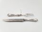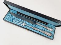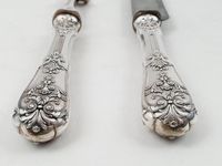 HENIN & CIE, fin XIXe siècle : service à découper 2 pièces, dans son écrin de détaillant d’origine, à manches en argent fourré 950 mil. à décor Régence de lambrequins, feuilles d’acanthe et cartouches à coquilles, comprenant 1 fourchette à piquer (L. 28.3 cm) et 1 couteau à belle qualité de lame en acier (L. 33.2 cm). Minerve 1er titre de 1838 et poinçon de Maître (actif après 1896). Poids brut : 265 g. Petites rayures. TBE. Non chiffré.