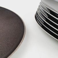 JAUNE DE CHROME, Collection NOIR PAILLETE à Limoges, période contemporaine : suite de 9 assiettes en porcelaine émaillée noir et paillettes métalliques à liseré platine. Signées. Diam. : 26 cm. Très légères usures au platine, ayant très peu servi. TBE.La manufacture JAUNE DE CHROME située près de Limoges est particulièrement reconnue pour l’originalité et l’exclusivité de sa technique d’émaillage associant des émaux traditionnels à des composants métalliques conférant un aspect pailleté.