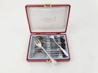 L’ORFEVRIER, période contemporaine, post 83 : suite de 12 cuillers à huitres en métal argenté baguette. Nouveau poinçon carré depuis 1983. L. 13 cm. TBE. Non chiffrées. Avec son écrin.