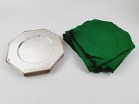 Suite moderne de 12 assiettes de présentation octogonales en métal argenté, modèle à pans et gradins. Travail étranger non signé. Diam. 32.7 cm. Légères rayures. TBE général. Avec 12 housses vertes.