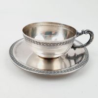 Travail étranger, XXe siècle: suite de 6 tasses et sous-tasses en argent 916 mil, unies à frises de fleurettes cerclées et anses volutes feuillagées. Poinçon étranger (amphore dans un ovale). Cygne français. Non chiffrées. Poids : 665.8 g. Dim. tasse : 4,5 x 10,7. Diam. sous-tasse 12,5 cm. Légères rayures et déformations d’usage, TBE.
