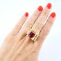 Bague tank en or 750 mil. et platine 850 mil. ornée d’une pierre imitation rouge rectangulaire à pans coupés, réhaussée de diamants TA (TDD : 56) (largeur : 1,7 cm environ) (légères égrisures à la pierre, éclat et manque de matière sur un diamant, trace de mise à grandeur). 19,1 g. brut
