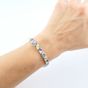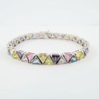 Bracelet en or gris 750 mil. à maillons triangulaires articulés sertis de pierres imitation de couleur (longueur : 18 cm environ) (largeur : 0,6 cm environ) (éclats et manque de matière). 27,5 g. brut