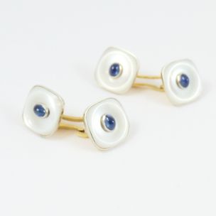 Paire de boutons de manchettes en or 750 mil à plateaux carrés, ajourés de tubes, centrés d'un cabochon de lapis lazuli (Dim : 1,7 cm). 14,9 g brut.