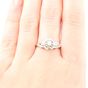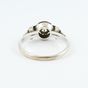 Bague en or gris 750 mil. à chaton géométrique orné d’un diamant brillanté de 0,07 carat environ épaulé de roses. (TDD : 57,5). (Trace de mise à grandeur). 3,8 g. brut