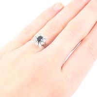 Bague fleur carrée en or gris 750 mil. centrée d’un saphir taille ovale dans un entourage de diamants 8/8. Travail français. (TDD : 50). 2,7 g. brut