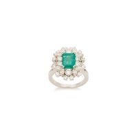Bague en or gris 585 millièmes ornée au centre d’une émeraude rectangulaire à pans coupés dans un entourage de diamants navettes et ronds de taille brillant. (Égrisures et givres en surface). Tour de doigt : 54. Poids brut : 7,5 g