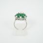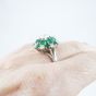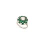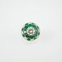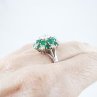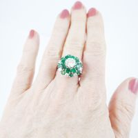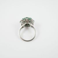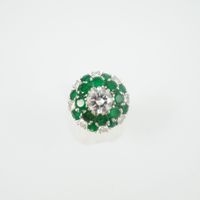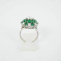 Bague en or gris 750 millièmes, le centre à décor de fleur orné d’émeraudes et diamants ronds de taille brillant, un plus important. (Égrisures et manques). Tour de doigt : 55. Poids brut : 8,4 g. Accompagnée d’un rapport diamant de C.G.L. no 28712 / NP162 du 15/03/2023 précisant : – Masse : 1,16 ct – Couleur : H – Pureté : SI1 – Fluorescence : Faint – Dimensions : 6,93 – 6,99 × 3,94 mm