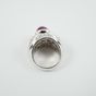 Bague en or gris 750 millièmes, le centre de forme bombée orné d’un rubis probablement traité, dans un pavage de diamants ronds de taille brillant. Tour de doigt : 46. Poids brut : 15,3 g