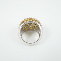 Bague en or gris 750 millièmes, le centre de forme bombée orné de trois diamants ronds de taille brillant dans un pavage de pierres jaunes / oranges, pour certaines des saphirs jaunes ou oranges. (Givres en surface, manque à une pierre). Tour de doigt : 47,5. Poids brut : 12,0 g. Poids approximatif du diamant principal : 0,90 / 1,10 ct.