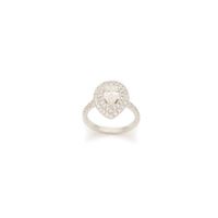 Bague en or gris 750 millièmes ornée au centre d’un diamant poire dans un double entourage de diamants ronds de taille brillant. Tour de doigt : 49. Poids brut : 3,4 g.