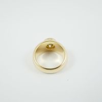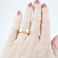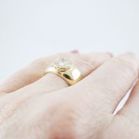 Bague en or jaune 750 millièmes ornée au centre d’un diamant rond de taille brillant serti clos. Tour de doigt : 50. Poids brut : 8,4 g. Accompagnée d’un rapport diamant de C.G.L. no 28728 / NP156 du 15/03/2023 précisant : – Masse : 1,58 ct – Couleur : L – Pureté : VS2 – Fluorescence : Faint – Dimensions : 7,71 – 7,75 × 4,36 mm.