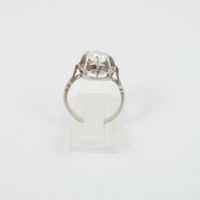 Bague en platine 850 millièmes ornée d’un diamant rond de taille brillant. Tour de doigt : 53 environ. Poids brut : 4,4 g. Accompagnée d’un rapport diamant de C.G.L. no 28708 / NP154 du 15/03/2023 précisant : – Masse : 1,00 ct – Couleur : E – Pureté : SI2 – Fluorescence : Faint – Dimensions : 6,80 – 6,84 × 3,83 mm.