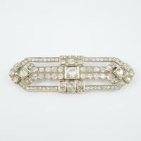 Broche plaque en or gris 750 millièmes ajourée à décor de motifs géométriques entièrement sertie de diamants ronds de taille ancienne, un au centre plus important. (Légère cassure et traces de réparation). Longueur : 7 cm. Poids brut :13,3 g.