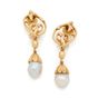 Paire de pendants d’oreilles en or jaune 750 millièmes, chacun gravé et à décor d’agrafes de feuillages retenant en pendentif une perle de culture grise. Système à pince. Hauteur : 4 cm. Poids brut : 15,5 g. Diamètre de la perle : 9,50 / 10,00 mm.