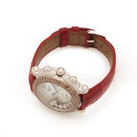 CHOPARD, Happy Sport. Montre ronde mixte. Référence 28/3340-52. Boîtier pavé de diamants en or blanc 750 millièmes signé et numéroté 958394 1227. Diamants mobiles sous verre. Cadran nacré à trois sous-compteurs, chiffres arabes, aiguilles glaives bleuies et guichet date à 4h. Mouvement quartz signé et numéroté. Diamètre : 39 mm environ. Bracelet en cuir (*) avec boucle ardillon en or blanc 750 millièmes signée. Poids brut : 92,3 g. Sans écrin ni papiers.