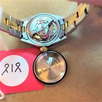 ROLEX, Datejust. Montre de femme ronde. Boîtier en acier numéroté U???85 (référence et numéro illisible avec l’usure). Lunette cannelée et couronne en or jaune 750 millièmes. Cadran champagne à index appliqués, guichet date à 3h. Mouvement mécanique à remontage automatique. Calibre 2135. Diamètre : 26 mm environ. Bracelet Oyster en acier avec maillons centraux en or jaune 750 millièmeset boucle déployante signée. Poids brut : 54,1 g. Sans écrin ni papiers. E) (art. 524 bis du CGI, al. C).