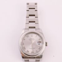 ROLEX, Datejust. Montre d’homme ronde. Référence 116200. Boîtier en acier signé et numéroté G540592. Cadran argenté à chiffres romains, guichet date à 3h. Mouvement mécanique à remontage automatique. Calibre 3135. Diamètre : 36 mm environ. Bracelet Oyster en acier avec boucle déployante signée. Sans écrin ni papiers.