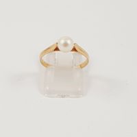 Bague en or 750 mil sertie d’une perle de culture, travail français (TDD : 56) (diam. perle : 5.9 mm environ) (traces de colle à la base de la perle). 1.8 g. brut
