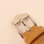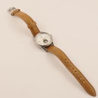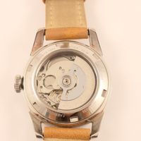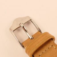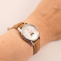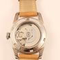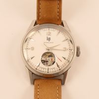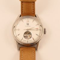 LIP « Himalaya ». Montre bracelet de dame en acier, boîtier rond (diam. : 27 mm environ), cadran blanc à chiffres arabes et épis appliqués, mouvement automatique squelette, bracelet en cuir usagé et boucle ardillon en acier siglée. Signée et numérotée. Fabriqué à Besançon. (long. totale : 22.5 cm) Sans écrin.