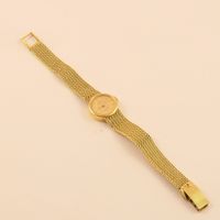OMEGA. Bracelet-montre de dame en or 750 mil, petit boîtier rond, cadran doré texturé, index épis appliqués, mouvement à quartz, bracelet ruban et fermoir à cliquet en or siglé. Signé. (diam. boîtier : 1.8 mm ; l. : 16 cm) (bracelet déformé, traces de soudure). 38.7 g. brut