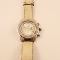 TECHNOMARINE « TechnoDiamond ». Montre-bracelet de dame chronographe en acier, boîtier rond, lunette tournante unidirectionnelle à deux rangs de diamants taille brillant, cadran nacre à index luminescents, à 3 compteurs secondaires et guichet dateur à 4H, mouvement à quartz, sur bracelet cuir blanc usé à boucle ardillon en acier non d’origine. Signée et numérotée. (Diamètre boîtier : 35 mm environ) (fond de boîte remonté à l’envers, salissures, en l’état).