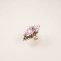 Bague en or gris 750 mil. à décor ajouré orné d’une importante améthyste taille poire facettée (à ressertir) rehaussée de diamants brillantés et diamants bruns. (Dimensions chaton : 3,5 x 2,6 cm) (TDD : 55). (Améthyste à ressertir avec petites égrisures). 18,7 g. brut