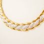 Collier deux ors 750 mil. à maille tressée fantaisie en chute, en partie pavé de pierres blanches imitations, fermoir cliquet avec huit de sécurité. (Longueur : 44 cm environ ; Largeur : 1- 1,7 cm). 62,8 g. brut