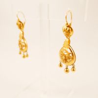 Paire de pendants d’oreilles dormeuses en or 750 mil. à décor ajouré ciselé de fleurs et chacun retenant en pampilles 3 perles d’or. Travail français de la fin du XIX ème siècle. (Hauteur : 4 cm environ). (Choc-déformation à l’une). 2,7 g.