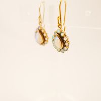 Paire de pendants d’oreilles en or 750 mil. chacun serti d’une opale cabochon taille poire dans un entourage de cabochons d’opales plus petits. (Hauteur : 2 cm environ). 2,7 g. brut