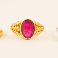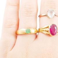 3 bagues, comprenant une en or gris centrée d’une aigue marine (TDD : 56), une en or 750 mil centrée d’une pierre imitation rouge (TDD :56). Travail français. Une en or 750 mil centrée d’une émeraude (TDD : 54). (Egrisures). 9,1 g. brut.