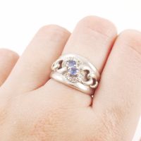 Bague bandeau ajourée en or gris 750 mil. centrée de deux pierres bleues dans un entourage de petits diamants 8/8. (Largeur : 1,4 cm environ) (TDD : 53). 5,3 g. brut.