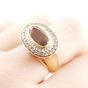 Bague en or 750 mil. à chaton ovale ornée d’un quartz fumé serti clos, dans un double entourage de diamants et diamants bruns. (Largeur : 1,4 cm) (TDD : 54). 8,6 g. brut.