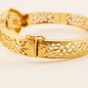 Bracelet en or 750 mil. ajouré, serti d’une pierre imitation centrale rouge, épaulée par deux petites pierres imitations. Fermoir cliquet avec huit de sécurité. (Largeur : 2 cm environ ; Longueur : 16,5 cm environ). 24,8 g. brut.