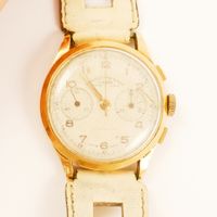 CHRONOGRAPHE SUISSE « Sada », Bracelet-montre en or 750 mil. bracelet en cuir blanc non d’origine. De forme ronde, chronographe, cadran argenté à chiffres arabes, 2 compteurs secondaires pour l’indication des minutes et des secondes. Fond clippé. Cuvette en métal (Diamètre : 40 mm environ) (Révision à prévoir) (verre très abîmé). 45,5 g. brut.