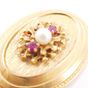 Pendentif en or 750 mil. guilloché, centré d’une perle de culture épaulée de deux pierres imitation rouges. Travail français. (Longueur : 3,8 ; Largeur : 2,2 cm environ). 2,9 g. brut.
