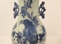 CHINE, début du XXème siècle. Grand vase de forme balustre en faïence émaillée céladon à décor en camaïeu bleu d’un oiseau branché et de pivoines. Monté en lampe, sur un socle en bois. (Salissures). Hauteur totale : 55 cm.